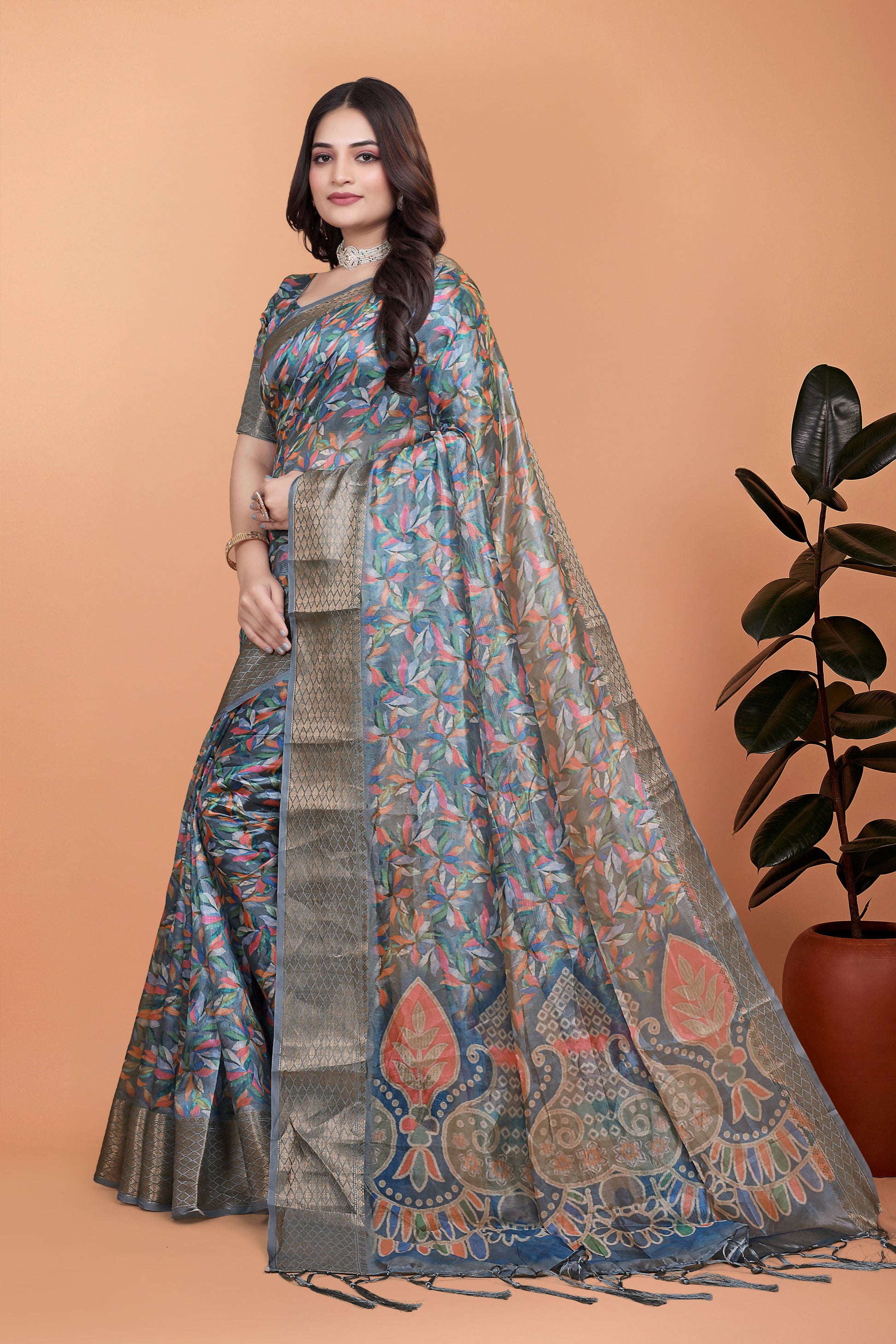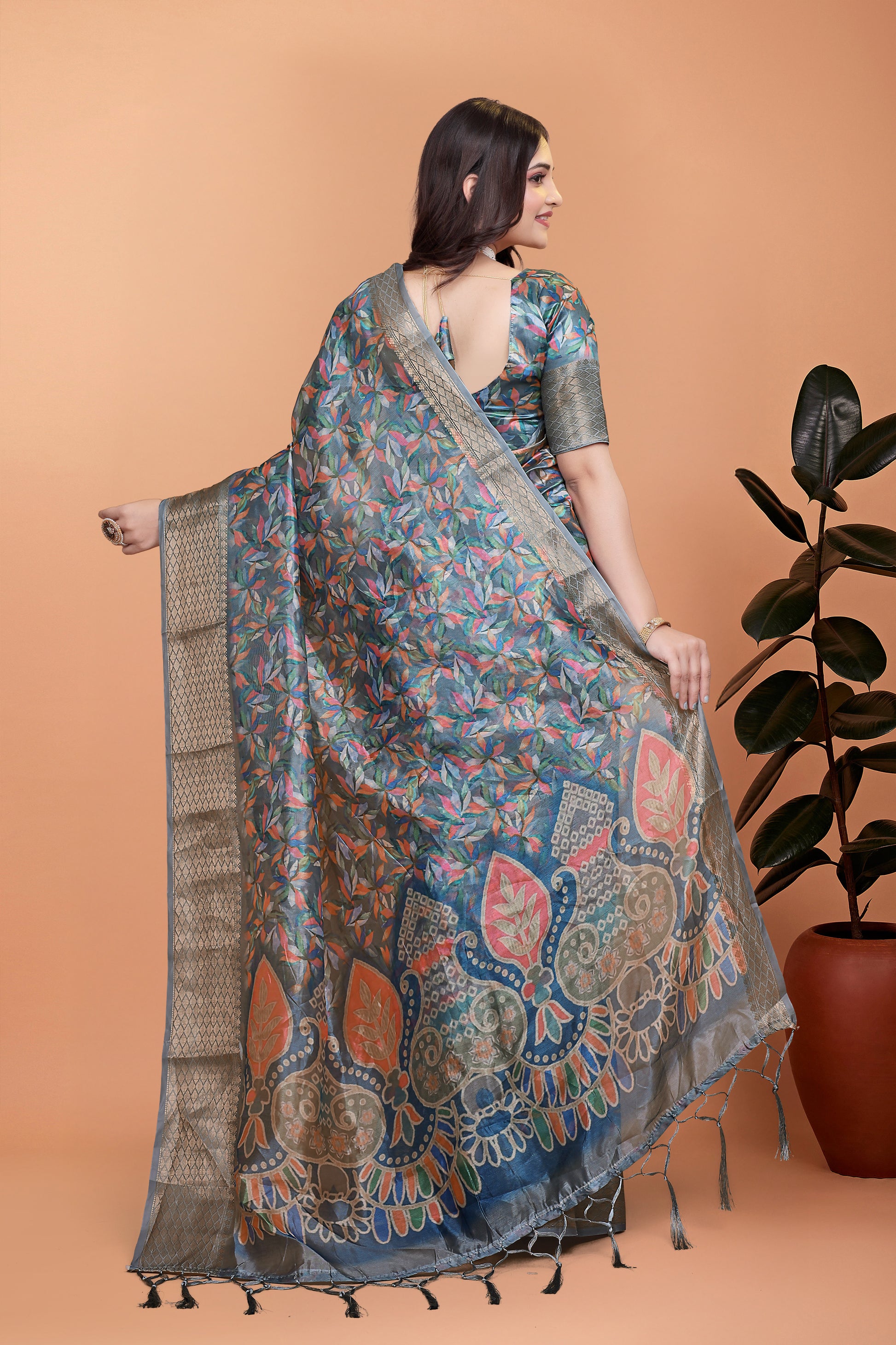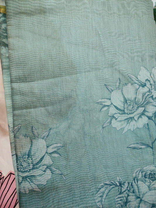 Sky Blue Floral Printed Soft Silk Saree With Zari Border For Women