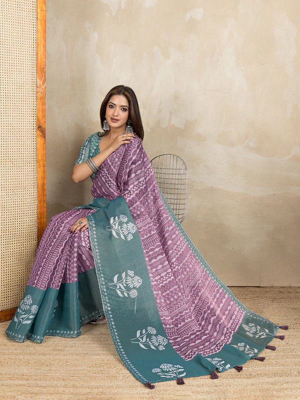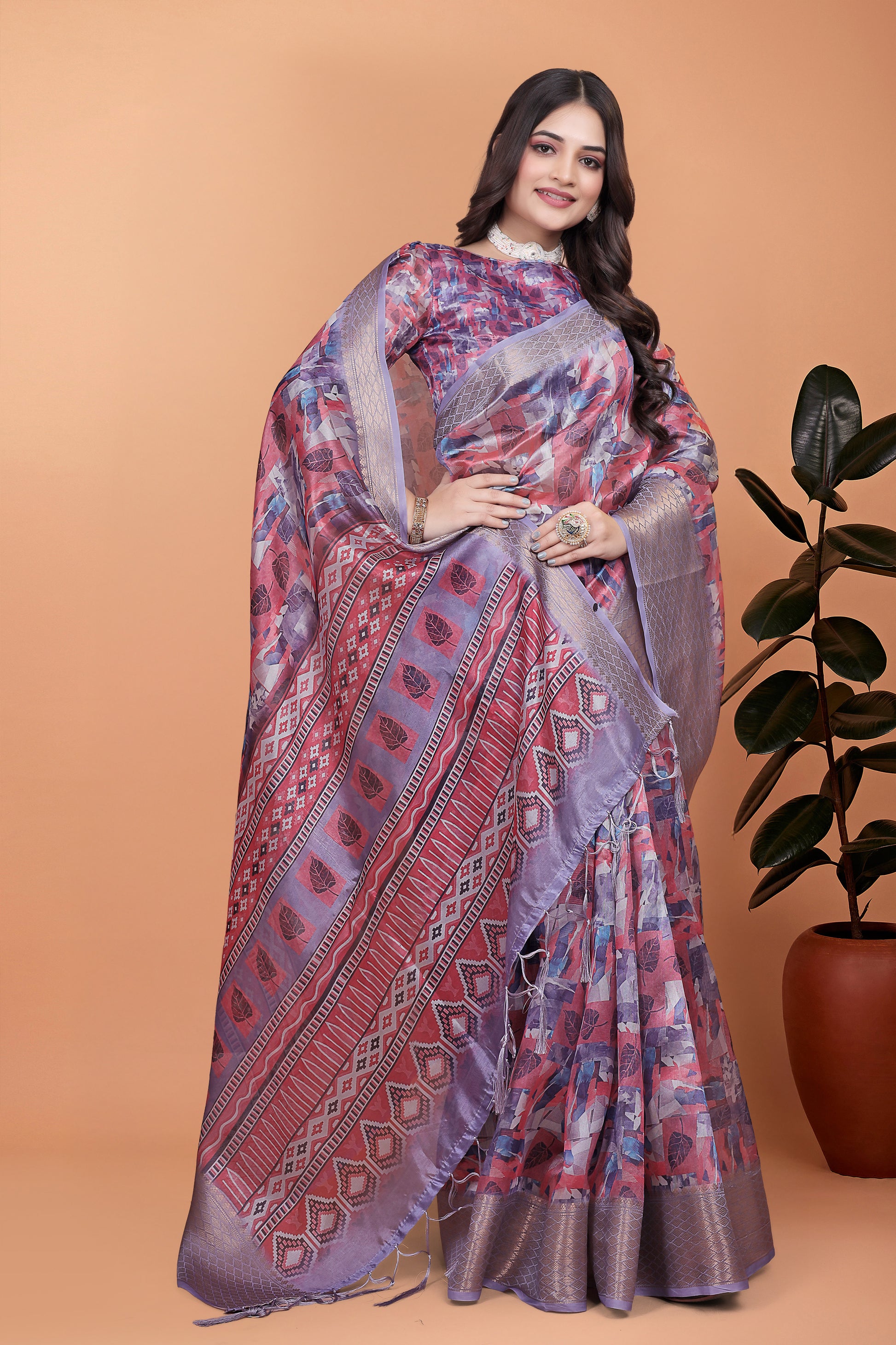 Lavender & Pink Soft Silk Saree With Copper Zari Border & Leaf Print For Women