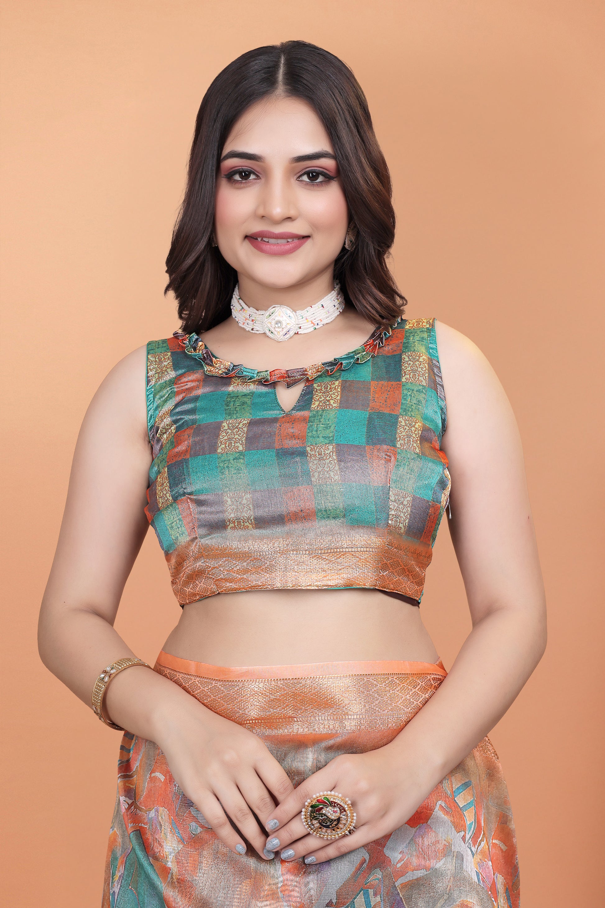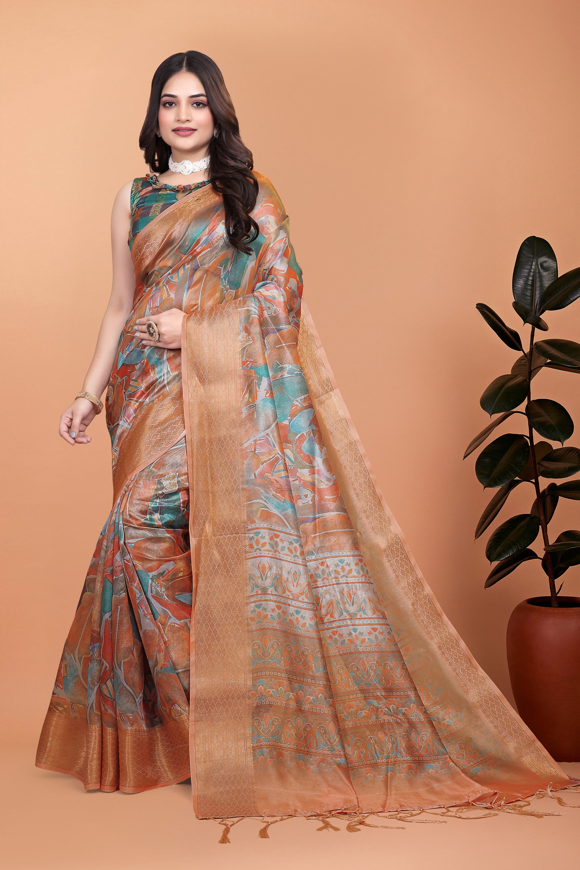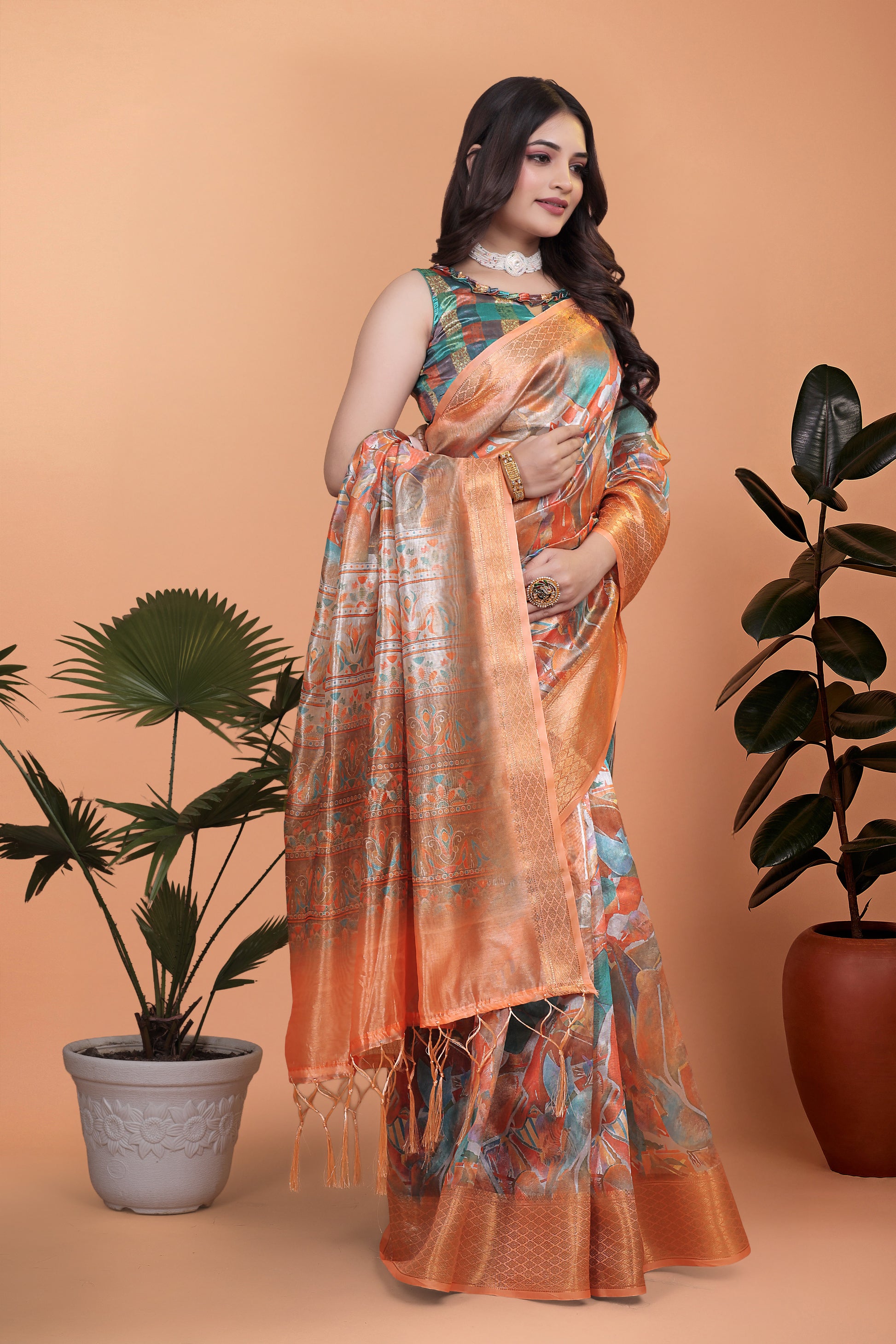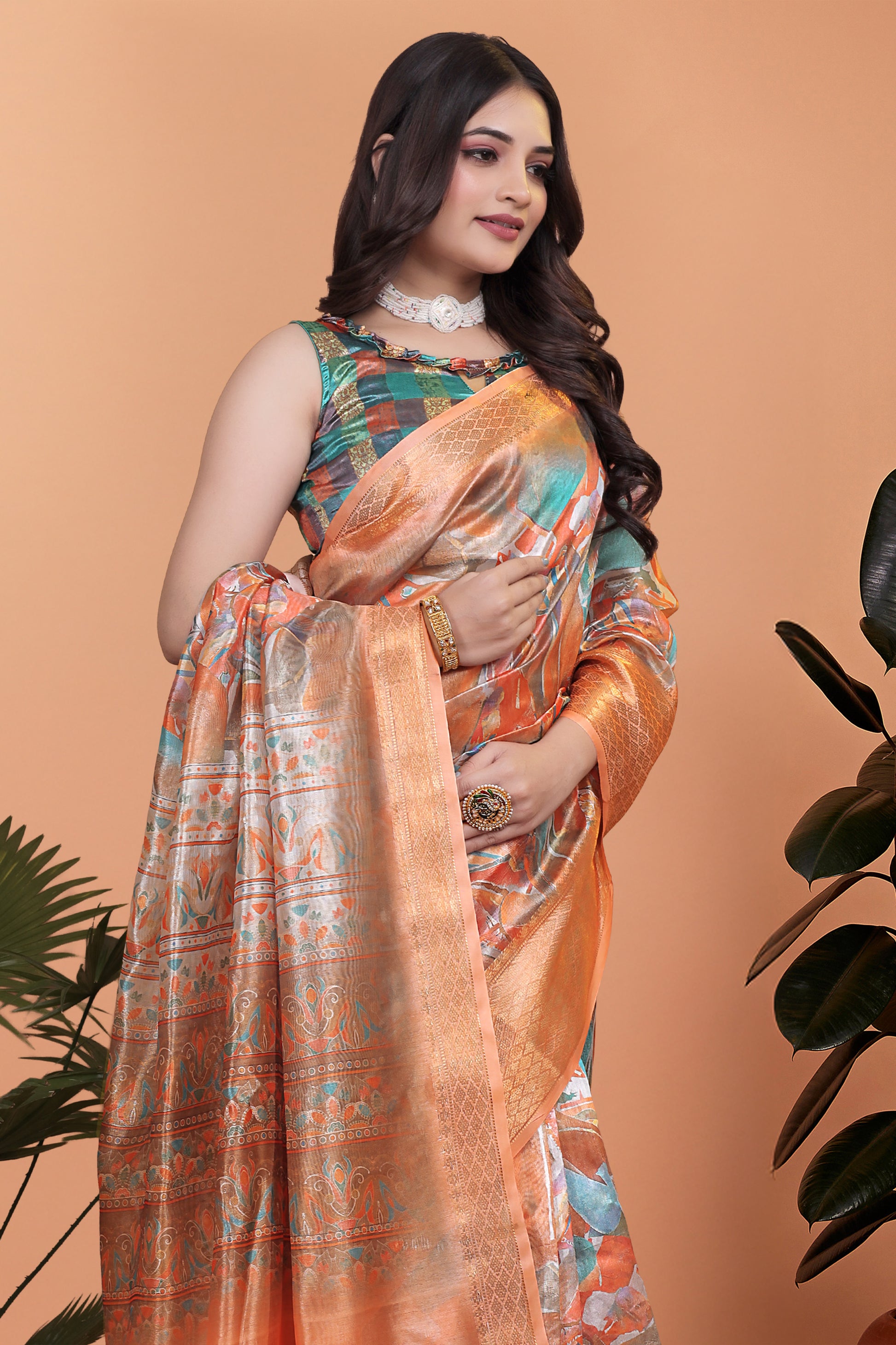 Orange & Copper Soft Silk Blend Saree With Zari Border And Printed Pallu For Women