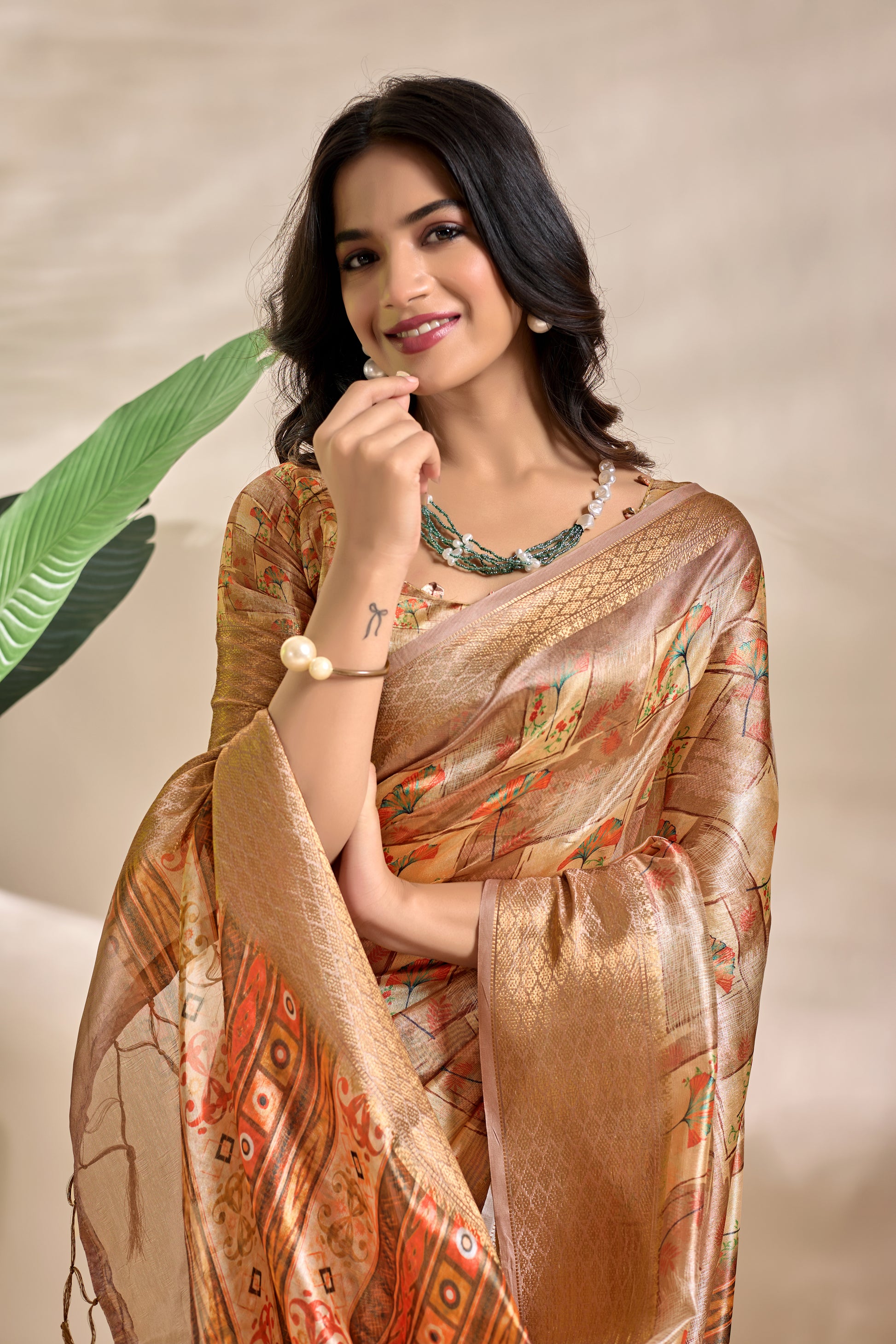 A perfect fusion of tradition and artistry, this soft silk blend saree showcases charming tribal-style elephant motifs across a soft beige base. The design evokes heritage elegance, complemented by a warm palette of earthy tones and a rich zari woven border.