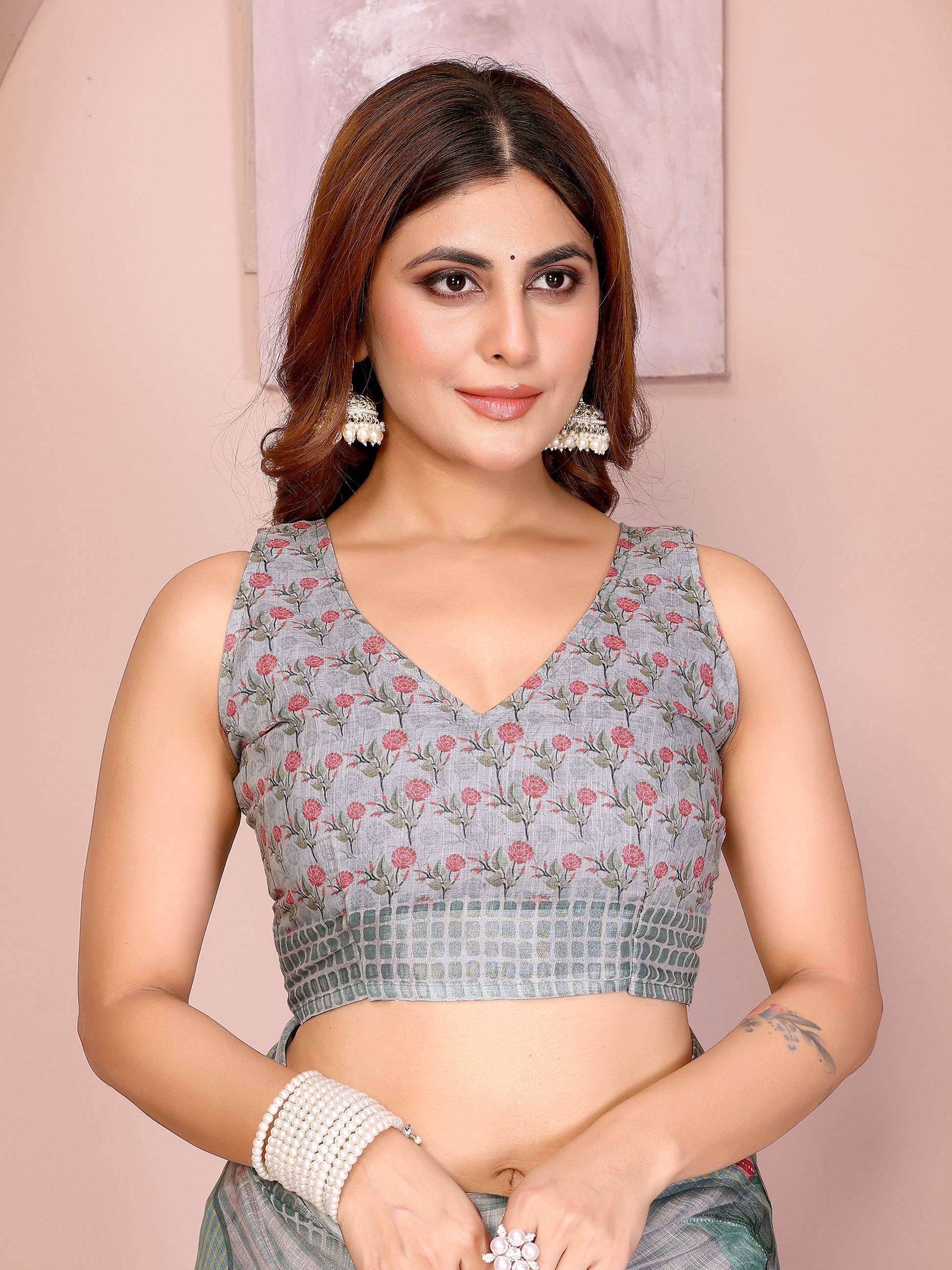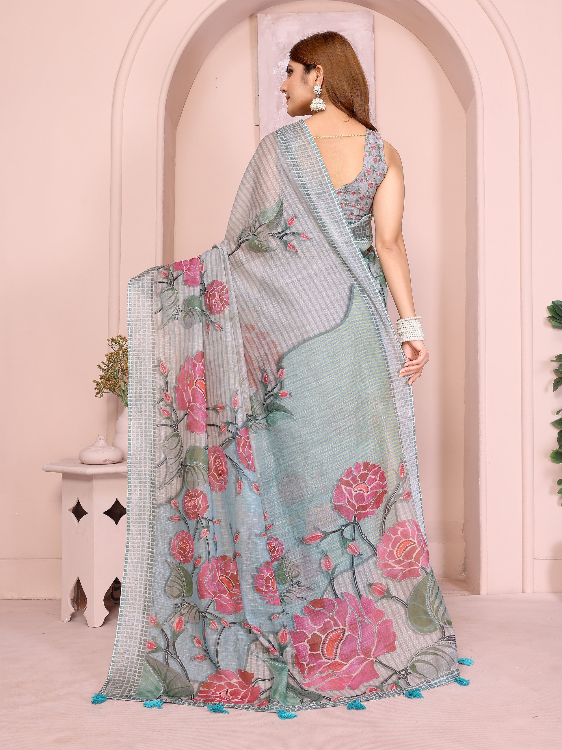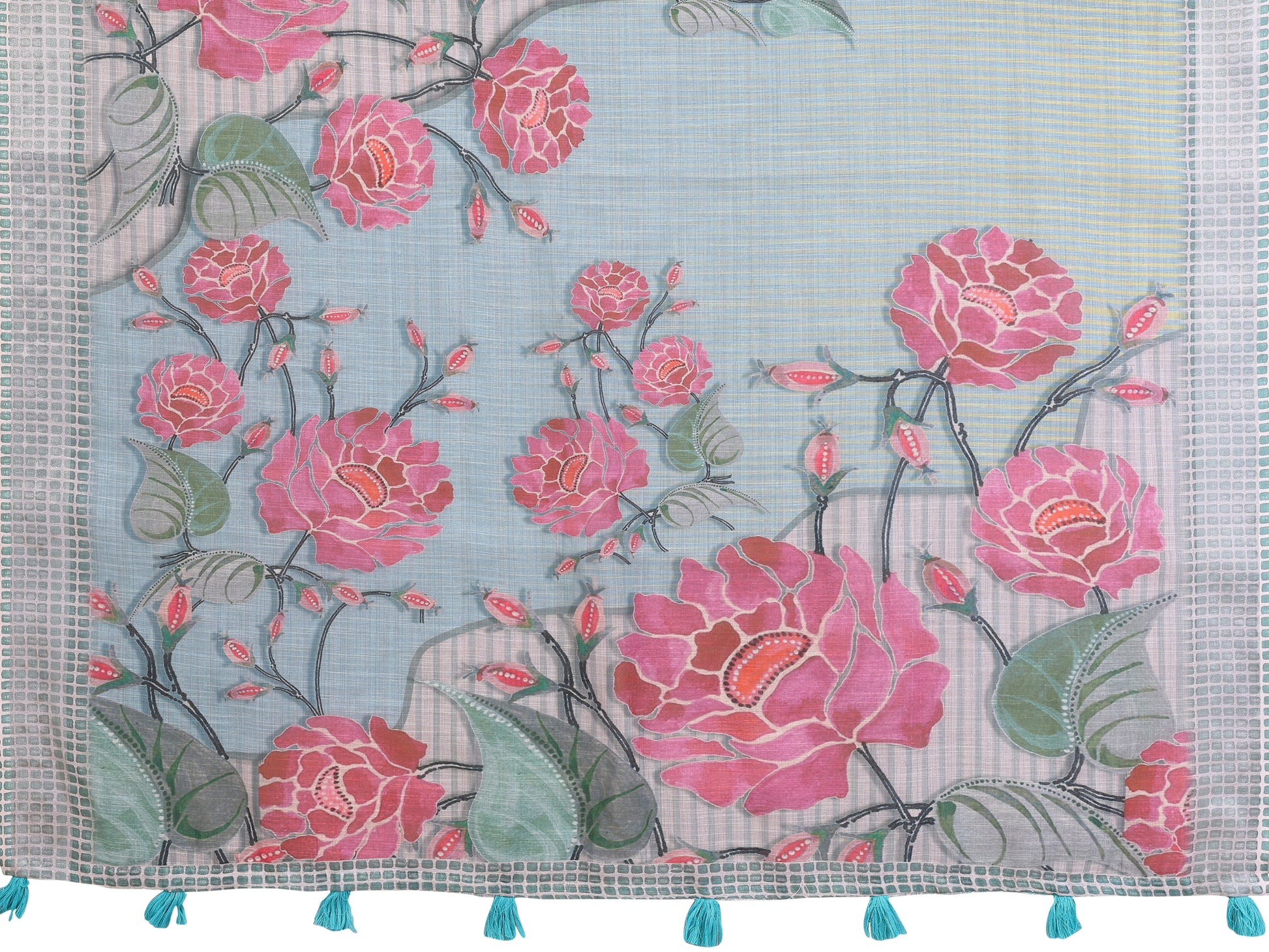 Elegant Grey-Blue Linen Cotton Saree With Bold Floral Prints For Women