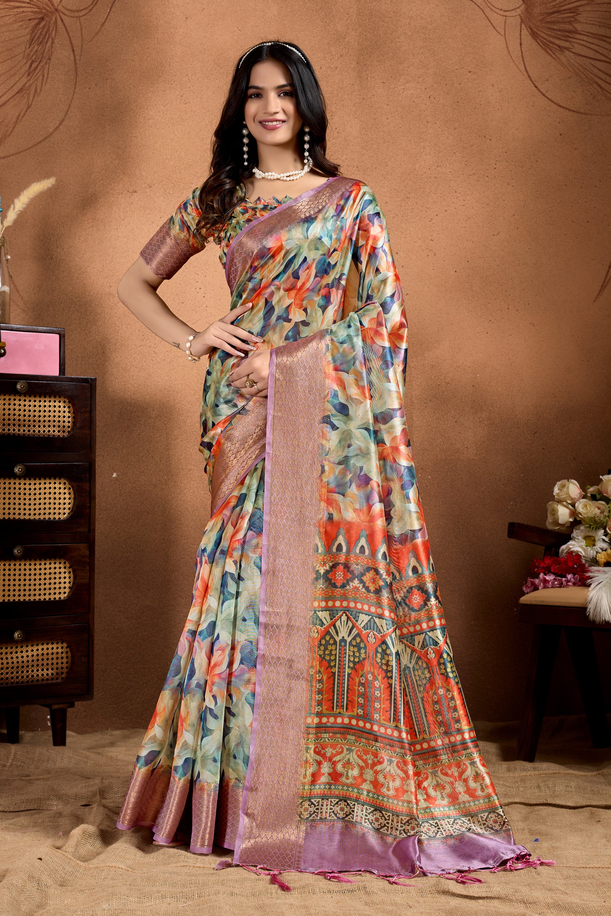 Drape yourself in artistic elegance with this multicolor soft silk saree featuring a mesmerizing abstract floral print that beautifully transitions into a traditional ethnic motif pallu. The intricate patterns in vibrant hues give it a regal charm, while the shimmering zari-woven lavender border adds an exquisite finish.