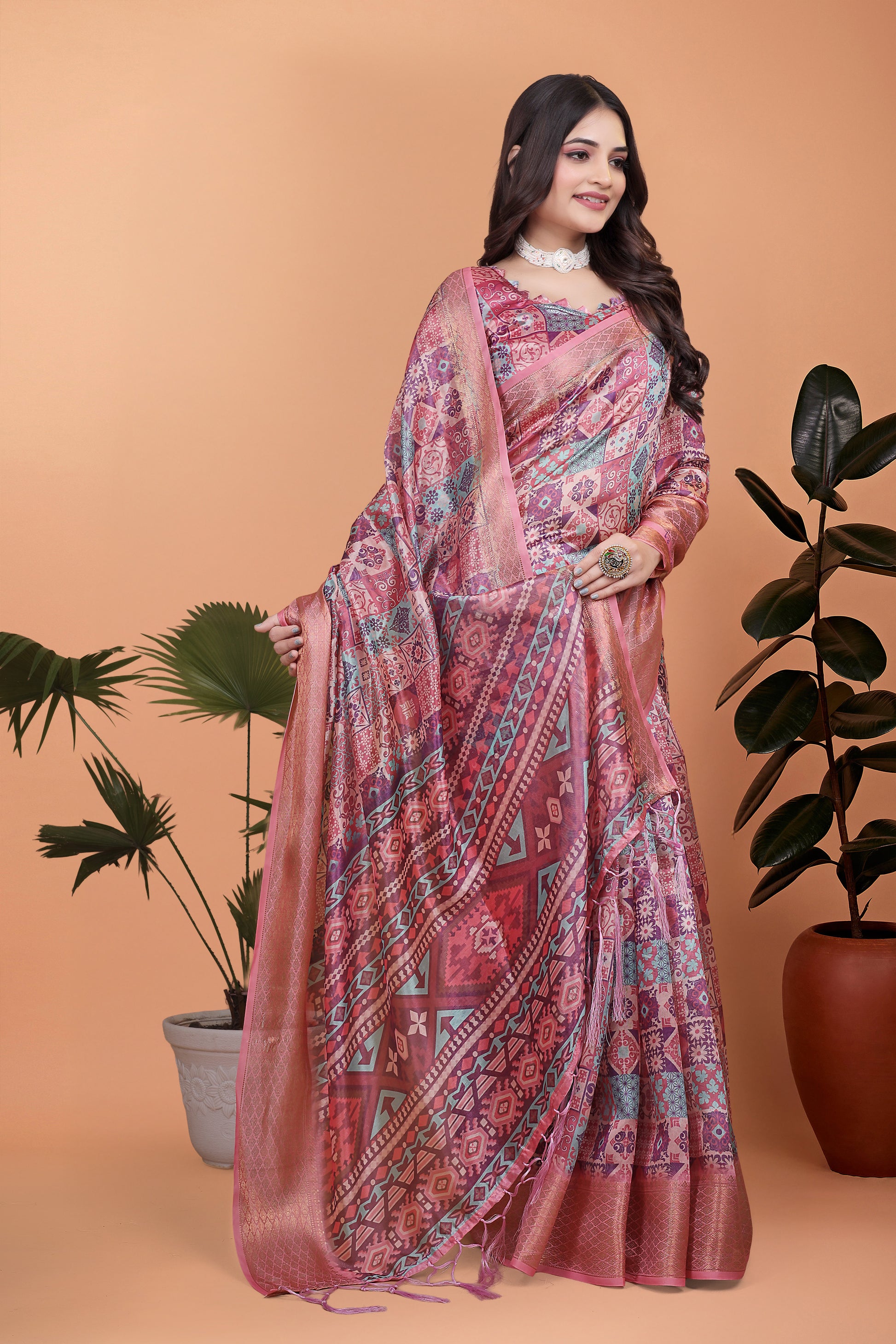 Pink Soft Silk Saree With Copper Zari Border & Multicolor Pallu For Women