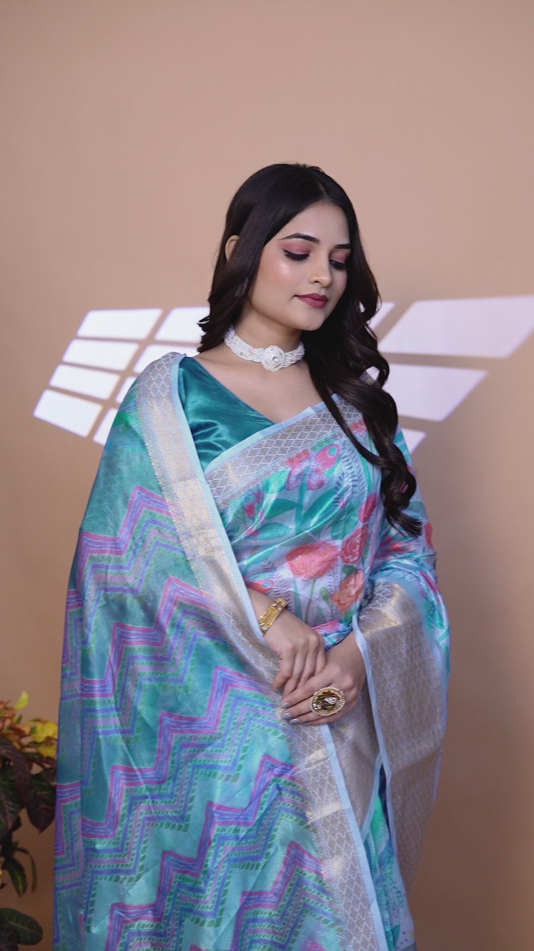 Step into elegance with this stunning sky blue soft silk saree, adorned with delicate floral prints in shades of pink and purple. The graceful drape is enhanced by a beautifully woven zari border and pallu with chevron-style patterns, adding a touch of traditional charm to your festive look.