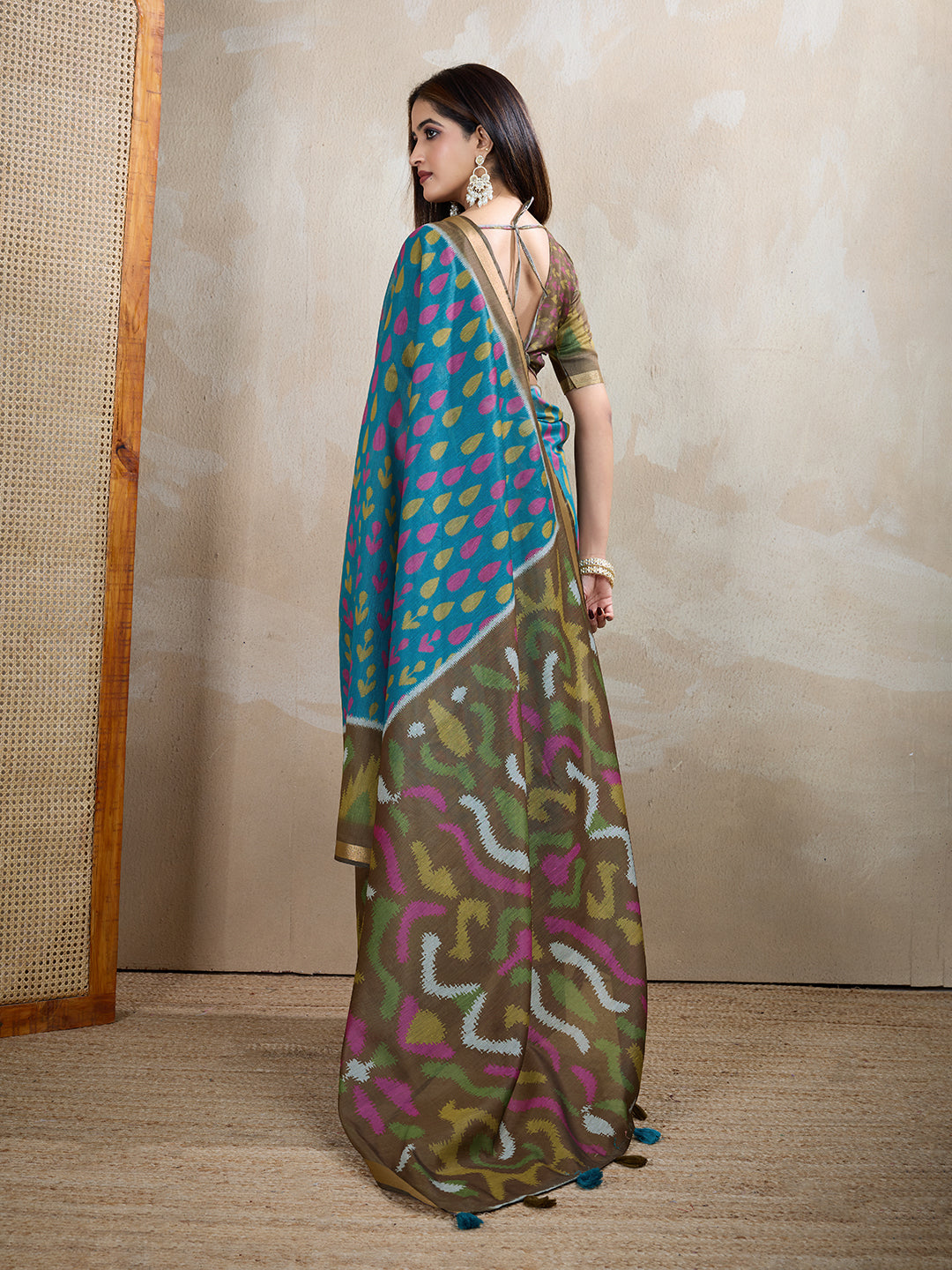 A stunning Chanderi saree in teal blue, featuring vibrant ikat-style prints in pink and yellow for a lively look. The olive green border and pallu are enriched with bold traditional patterns, adding depth and elegance. This saree combines grace with comfort, perfect for festive occasions and cultural gatherings.